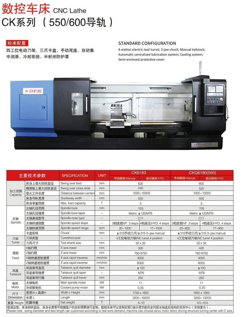 西门子、发那科、广数和凯恩帝等数控系统、液压或动力刀塔、气动或液压卡盘、液压尾座、全封闭防护罩